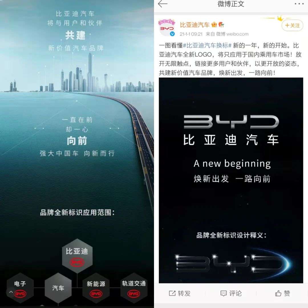 如前段时间,比亚迪发布了全新品牌LOGO,在内容不变的情况下略有“瘦身”,话题迅速蹿升至微博热搜榜首。围绕新旧两版LOGO,网友展开了一场“大家来找茬”比赛:“我怀疑比亚迪聘请了小米同款设计师。”随着讨论逐步从LOGO转移至品牌及产品,LOGO替换成就了比亚迪品牌的大规模破圈。