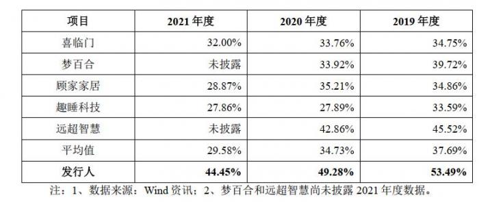 据招股书披露,部分已披露毛利率的同行业上市公司,2021年综合毛利率为29.58%,同期慕思股份毛利率则为44.45%。