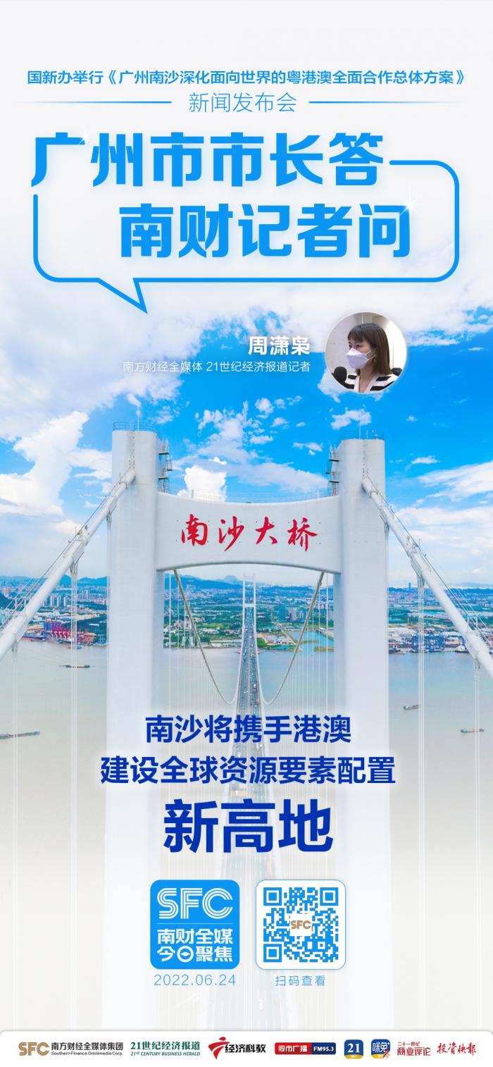 6月24日下午,国务院新闻办公室举行新闻发布会。国家发展改革委党组成员郭兰峰,财政部预算司司长王建凡,中国人民银行研究局局长王信和广东省委常委、常务副省长张虎,广州市委副书记、市长郭永航介绍《广州南沙深化面向世界的粤港澳全面合作总体方案》(下称《方案》)有关情况。南方财经全媒体21世纪经济报道记者现场提问。