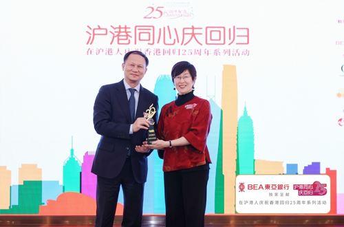 启动仪式上,香港特区政府驻上海经济贸易办事处主任蔡亮向东亚中国执行董事兼行长何舜华颁发回归纪念礼