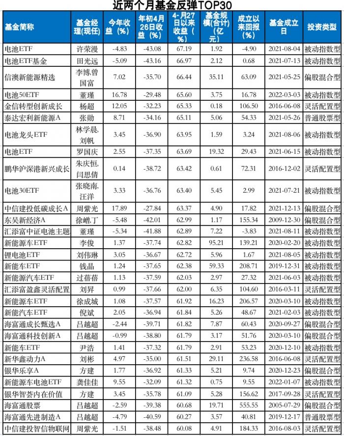 记者发现,近两个月基金“回血”最多的TOP30基金中,主要集中在偏成长基金,基本都是新能源基金。