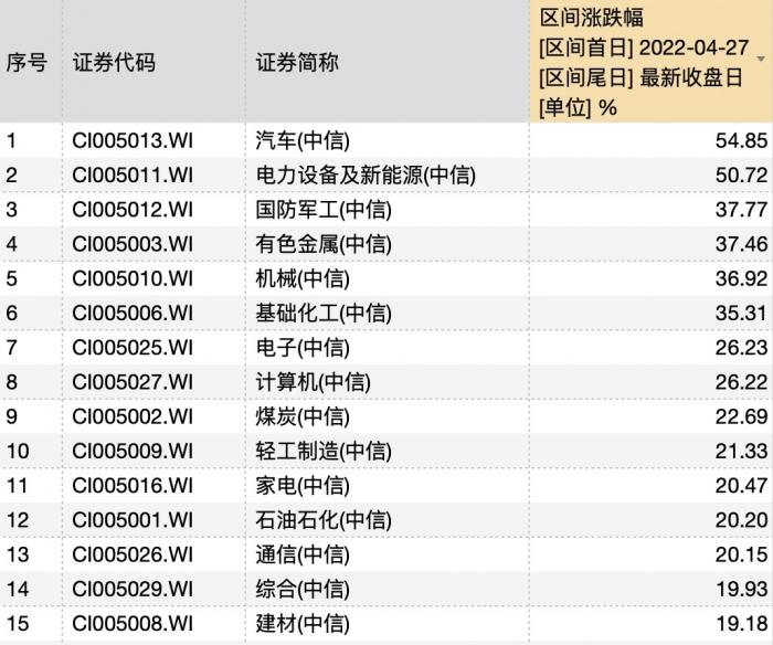 中信一级行业指数显示,最近两个月汽车指数大涨54.85%,电力设备及新能源大涨50.72%,远远高于排名第三的国防军工的37.77%。