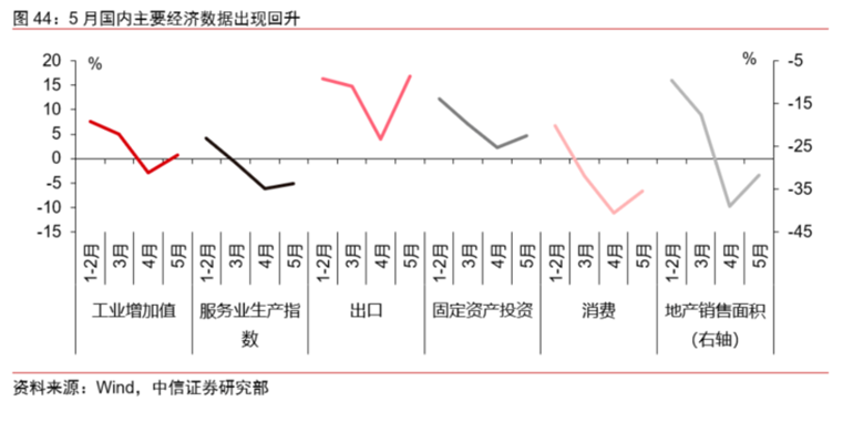 5月份,国民经济运行已显露出恢复势头,如5月工业增加值同比增速,由前月的下降2.9%回归到正增长区间,同比增长0.7%。5月出口同比增长16.9%,较前值回升13个百分点。