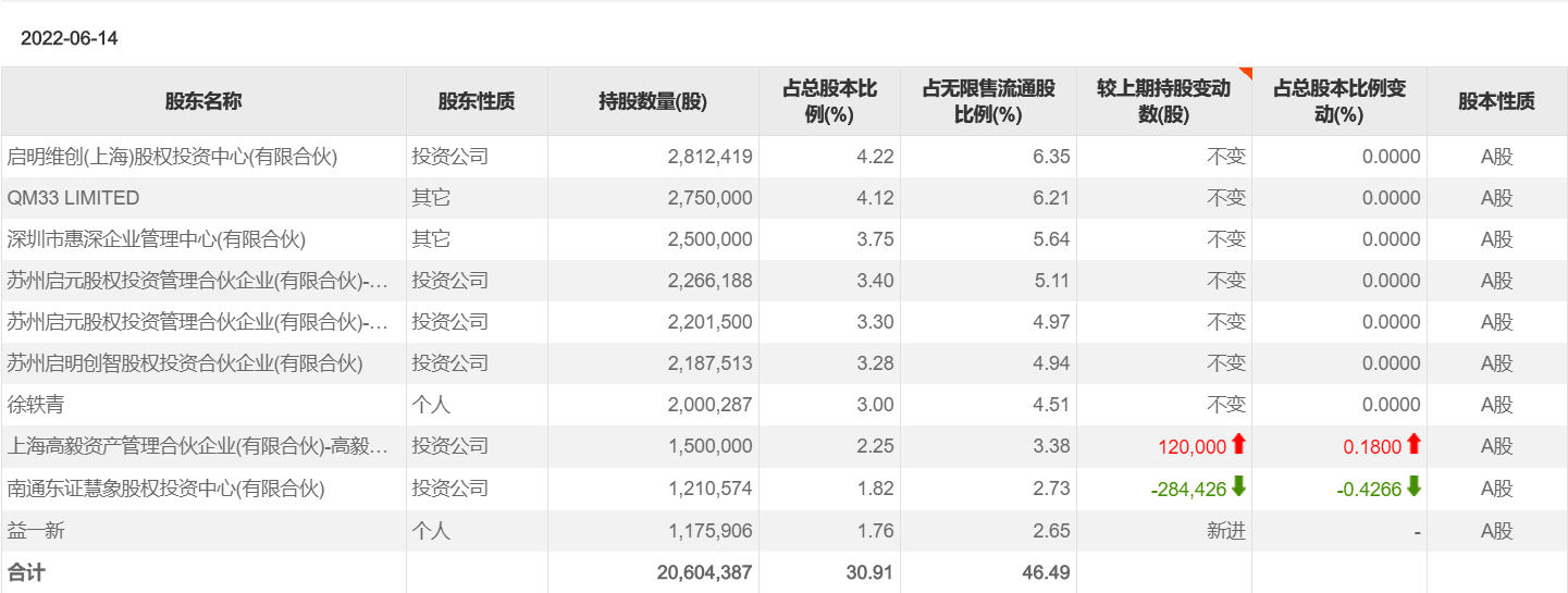 具体来看,6月21日,惠泰医疗发布一则关于回购股份事项前十大股东和前十大无限售条件股东持股信息的公告,内容显示,截至2022年6月14日,高毅资产基金经理冯柳管理的高毅邻山1号远望基金持有惠泰医疗150万股,相比一季度末增持了12万股,持股市值约3.1亿元,升至第八大流通股东。