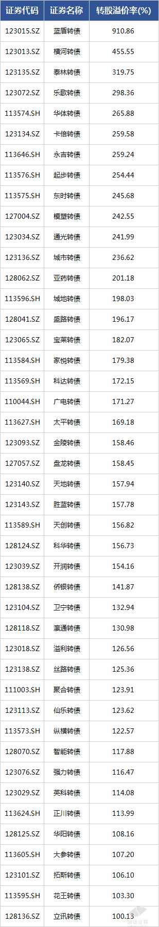 小信统计了目前转股溢价率超过100%的可转债,详情如下: