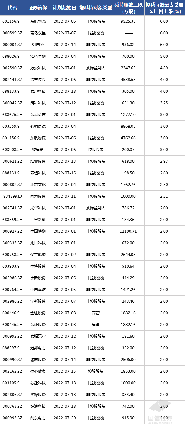 根据上市公司公告披露的减持计划,7月份,上市公司拟计划减持股份数量占公司总股本比例上限超过2%的公司如下: