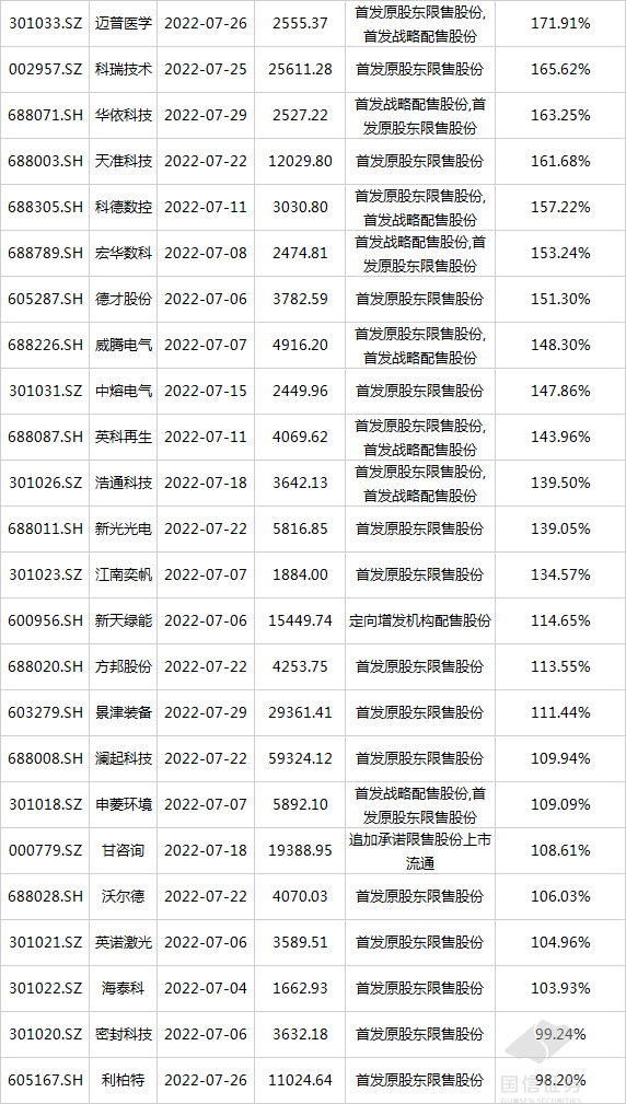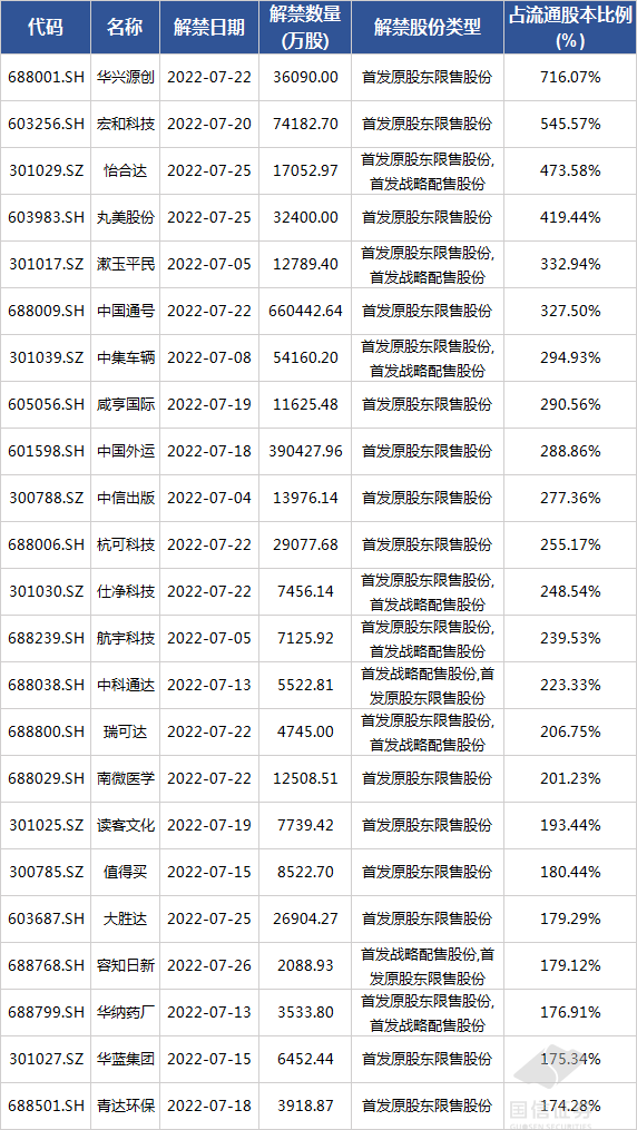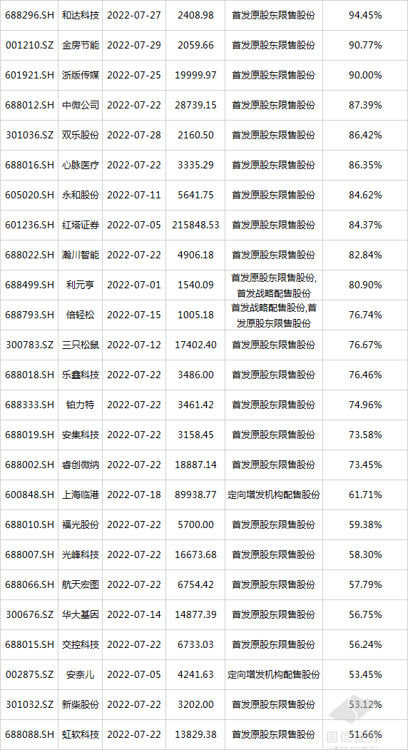 2022年7月,沪深两市共有280只个股存在限售解禁,解禁股本占流通股本比例超过50%的如下:
