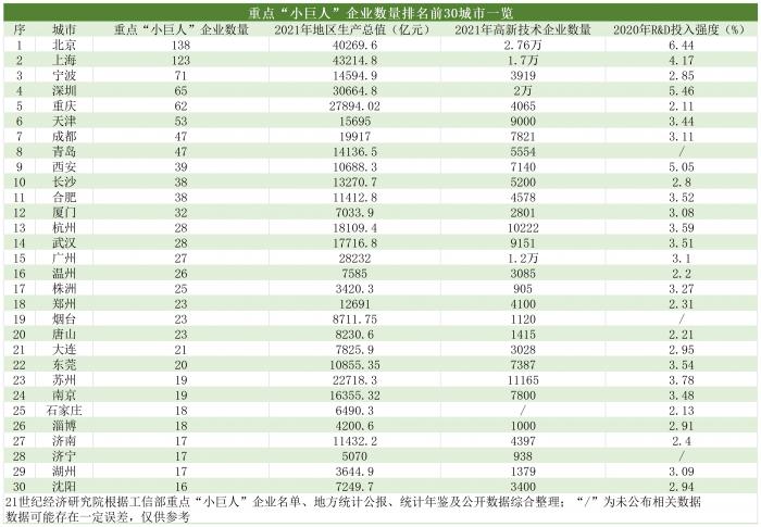 小巨人城市图谱①丨重点“小巨人”企业30强城市榜单:宁波、重庆“专而精”,武汉、南京、石家庄增势强劲