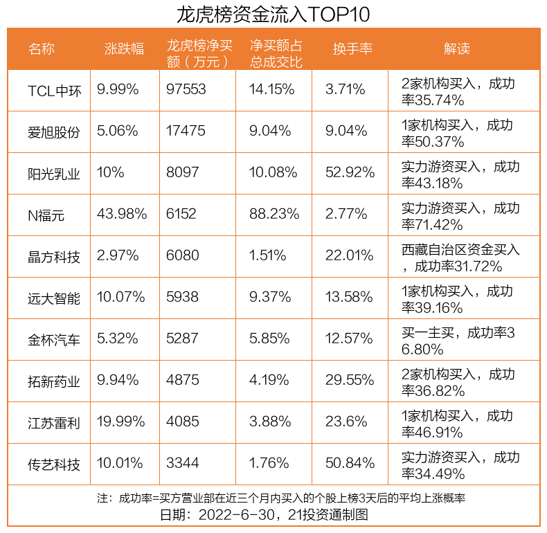 6月30日,上证指数上涨1.1%,深证成指上涨1.57%,创业板指上涨1.52%。盘后龙虎榜数据显示,共有54只个股因当日异动登上龙虎榜,资金净流入最多的是TCL中环(002129.SZ),达9.76亿元。