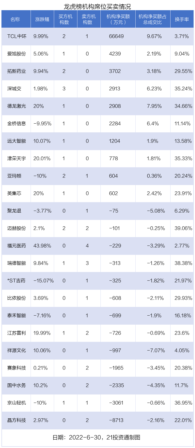 6月30日,23只个股龙虎榜出现了机构的身影,机构合计净买入6.57亿元。具体来看,机构净买入10股,净卖出13股。