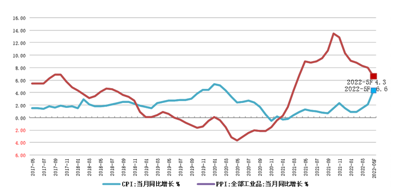 数据显示,5月份居民消费价格同比上涨2.1%环比下降0.2%;CPI方面。5月PPI同比上涨6.4%,环比上涨0.1%。PPI方面,工业生产者购进价格同比上涨9.1%,环比上涨0.5%。1—5月平均,工业生产者出厂价格比去年同期上涨8.1%,工业生产者购进价格上涨10.8%。国家统计局专家称2022年5月份CPI环比转降,PPI涨幅继续回落,表明通胀局势整体仍在可控范围内。