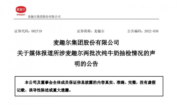 在此之前,有媒体曝出,“近日,浙江省庆元县市场监管局公示的2022年第4期食品抽检检验情况中称,麦趣尔集团股份有限公司生产的2批次纯牛奶不合格,不合格项目为丙二醇。”