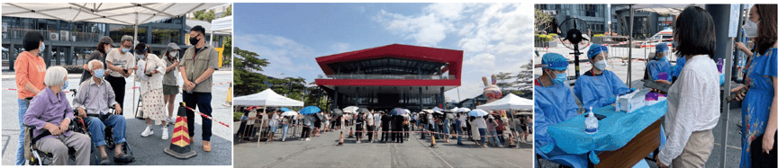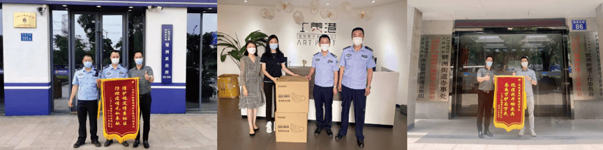 自广州新一轮疫情阻击战打响以来,全市人民都积极加入抗疫战线中,广州展现出英雄城市该有的模样。2021年5月31日,工美港园区闻令而动,首次设立核酸检测点,迅速规划好约1400平方米场地,设楼板遮阳防雨场地400平方米,落实人员、物资保障到位,搭设帐篷两个,提供水、饭餐、无线网络,为医护人员配置空调扇、大小风扇,开放有空调的休息厅提供医护人员使用,企业中高层领导现场指挥,企业党支部党员志愿者带头行动,共出动工作人员、安保人员50多人协同琶洲街道社区工作人员、医护人员、公安民警、志愿者等站在抗疫冲锋第一线。事后,工美港为海珠区琶洲街道办事处、海珠区琶洲派出所、广东省口腔医院、广州市红十字会医院、广州广渔医院等单位赠送了锦旗以及防疫物资以表感谢之情。在此之后,工美港更成为了琶洲街道定点核酸专场,先后进行了近十次上三万人次的核酸检测。