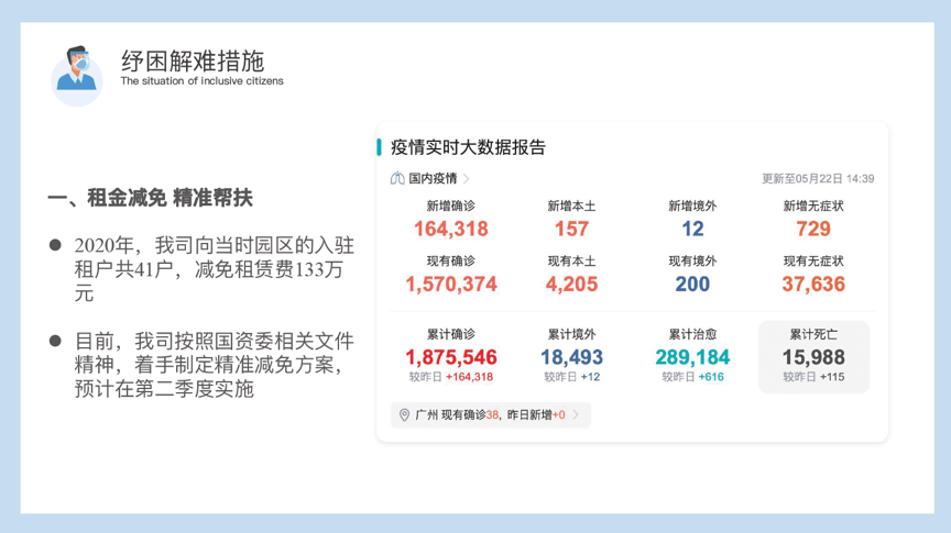 根据《中华人民共和国突发事件应对法》《中华人民共和国传染病防治法》和广东省突发公共卫生事件一级响应机制的有关规定。园区各企业主动响应《广东省人民政府关于企业复工和学校开学时间的通知》中“各类企业复工时间不早于2020年2月9日24时”的相关工作要求。基于不可遇见、不能避免、不能克服的客观情况,依据我国《传染病防治法》《突发事件应对法》《民法总则》第6条、《合同法》第117条等法律规定,并根据2020年1月30日《广州市房地产租赁协会穗租协函【2020】第04号文件《致全市业主(房东)的减租倡议书》的建议,我司向当时园区的入驻租户共41户,减免租赁费133万元。目前,我司按照国资委相关文件精神,着手制定精准减免方案,预计在第二季度实施。我们知道服务业、餐饮业等聚集性接触性行业仍然运行艰难,普遍面临消费市场萎缩、经营成本上升、人工租金上涨、防疫开支增加、平台佣金高企、融资难融资贵等突出问题,他们迫切更有针对性、更有力度的政策措施,帮扶其渡过难关、恢复发展。工美港针对入驻企业面临的困难,积极承担起减免租金的经济支持作为纾困解难措施,切实缓解企业成本压力,让他们得以度过难关。