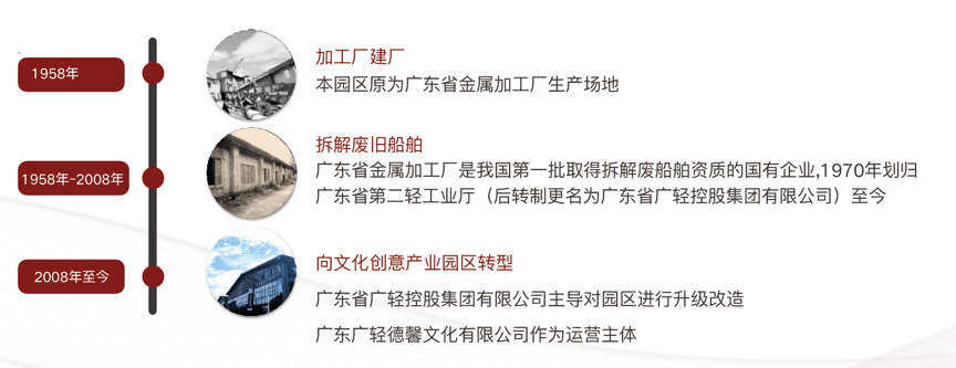 1958年,工美港所在地块是广东省金属加工厂的生产场地。这是全国最早的废船拆解工厂,也曾经是人气鼎盛的玩具加工厂。2008年起,随着公司主业的变化,逐步建设成为文化创意产业园。