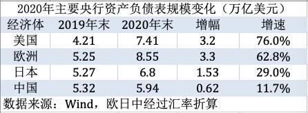 中国央行也推出多项举措应对疫情冲击,但相当克制。在价格型工具方面,中国央行2020年先后下调了逆回购利率、MLF利率,但仅下调了30BP;在数量型工具方面,中国央行通过多次降准和公开市场操作释放流动性。但从资产负债表来看,中国仅小幅扩张。Wind数据显示,2020年末中国央行资产负债表规模为5.94万亿美元,相比2019年末扩张11.7%。