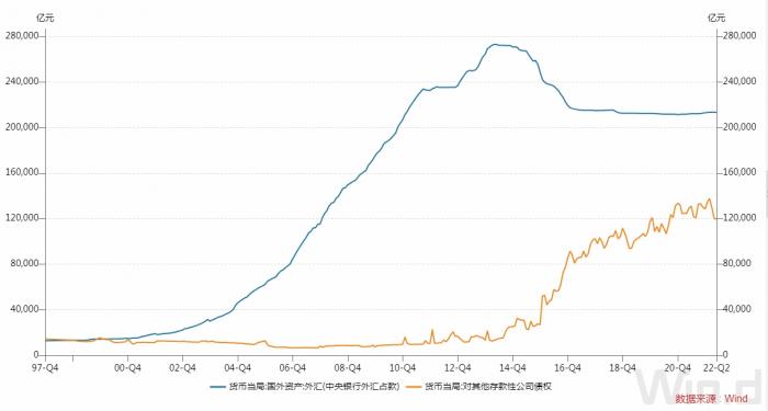 Wind数据显示,“对其他存款性公司债权”由2013年的不到2万亿增长至目前的13万亿左右,同期外汇占款由27万亿降至21万亿左右。