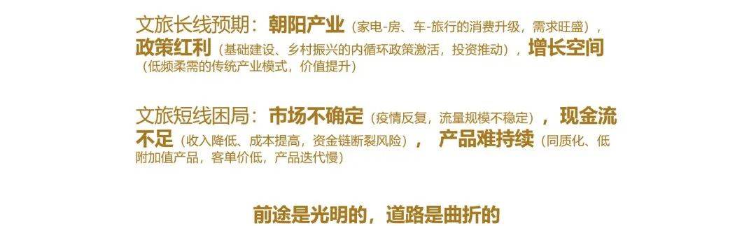 首先文旅长线预期是朝阳产业,对比房地产行业,文旅实际上一直处于上升通道,家电、房车、旅行的消费升级体现了其旺盛的需求,疫情也只是遏制了需求,并没有消除需求,在疫情发生向好变化时,文旅会出现爆发式增长;其次,行业发展享有政策红利,内循环条件下国家重点推动基础建设和乡村振兴,这两大领域的投资行为一旦得到激活,对文旅项目融资十分有利;行业增长空间巨大,目前行业仍处于低频柔需的传统产业模式,有很大的价值提升空间。因此,从长线来看,大家应该对文旅行业具备信心。而文旅短线困局首先是市场不确定,疫情反复,流量规模不稳定造成计划性会弱;其次现金流不足,收入降低、成本提高,资金链断裂风险;最后是产品难持续,区别于快消行业,文旅产品多数是资源型产品,同质化、低附加值产品多,客单价低,产品迭代慢。综上所述,我认为文旅产业前途是光明的,道路是曲折的。