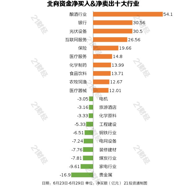 从净买入金额来看,北向资金在近五个交易日增持了73个行业,其中酿酒行业居首,净买入金额达54.10亿元,其次是银行行业,净买入30.56亿元。