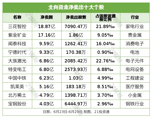 北向资金净卖出三花智控(002050.SZ)、紫金矿业(601899.SH)、闻泰科技(600745.SH)、宁德时代(300750.SZ)、大族激光(002008.SZ)居前,其中,三花智控被净卖出18.87亿元,紫金矿业被净卖出17.16亿元,闻泰科技被净卖出9.59亿元,宁德时代被净卖出9.33亿元,大族激光被净卖出6.86亿元。