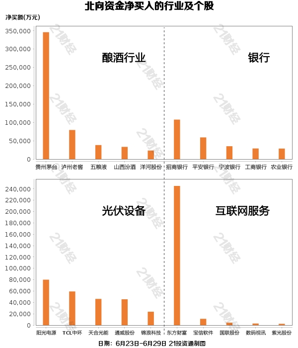 据21投资通(微信号ID:touzit21)智能监测,在近五个交易日(6月23日至24日,27日至29日),北向资金净买入318.82亿元,其中沪股通净买入160.03亿元,深股通净买入158.79亿元。