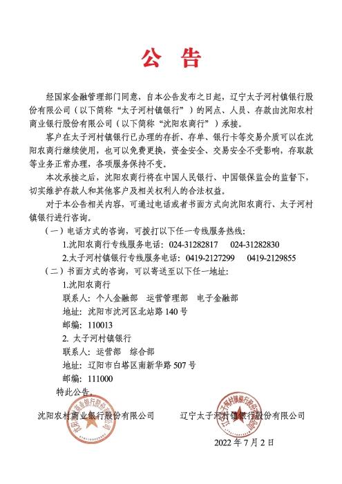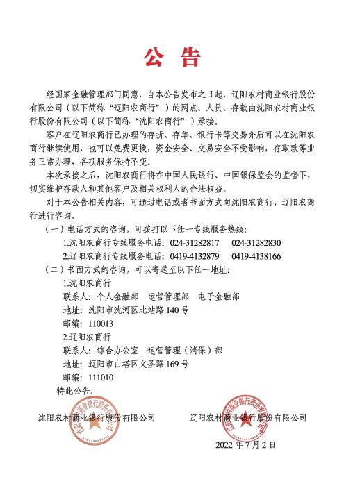 7月2日,沈阳农商行、辽阳农商行发布公告称,辽阳农商行的网点、人员和存款由沈阳农商行承接。