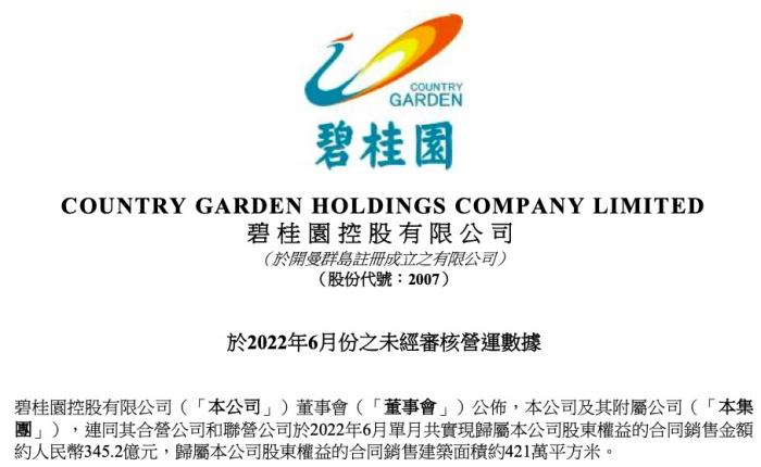 7月3日,碧桂园发布公告显示,今年上半年公司累计实现权益合同销售金额1851亿元;累计实现权益合同销售建筑面积2348万平方米。于6月实现权益合同销售金额约345.2亿元,环比增长20.21%,连续两个月实现环比增长;实现权益合同销售面积约421万平方米。