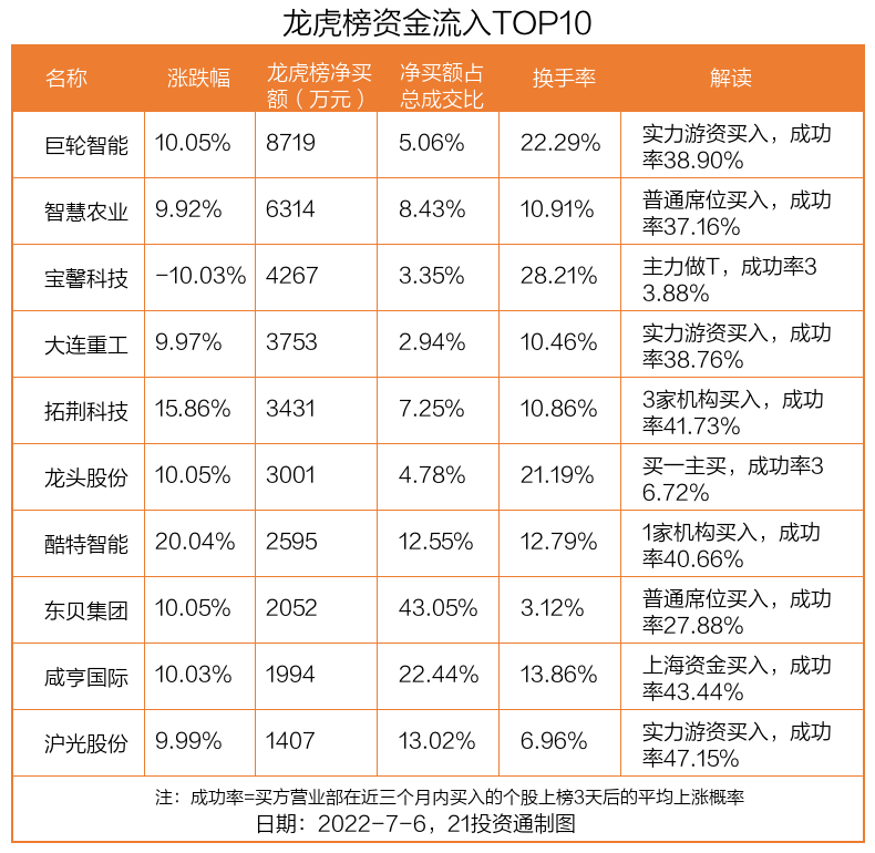 7月6日,上证指数下跌1.43%,深证成指下跌1.25%,创业板指下跌0.79%。盘后龙虎榜数据显示,共有51只个股因当日异动登上龙虎榜,资金净流入最多的是巨轮智能(002031.SZ),达0.87亿元。