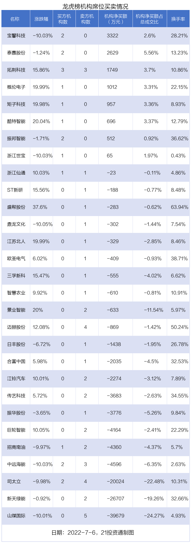 7月6日,29只个股龙虎榜出现了机构的身影,机构合计净卖出10.6亿元。具体来看,机构净买入8股,净卖出21股。