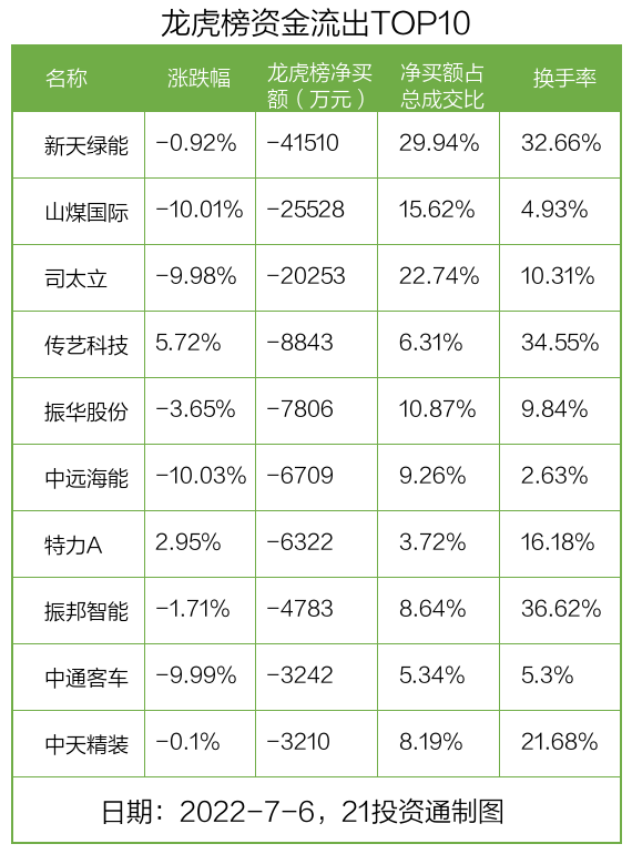 而龙虎榜中资金净流出最多的是新天绿能(600956.SH),被净卖出为4.15亿元,占总成交金额的29.94%。新天绿能收盘下跌0.92%,换手率为32.66%。