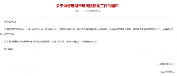 面对如此大幅波动,7月6日,上海黄金交易所下发通知,提醒各方做好近期市场风险控制工作,合理控制仓位,理性投资。
