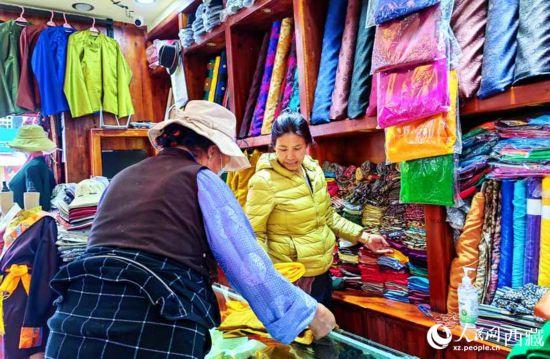 顾客正在卓玛的藏装店挑选服装。人民网 李海霞摄