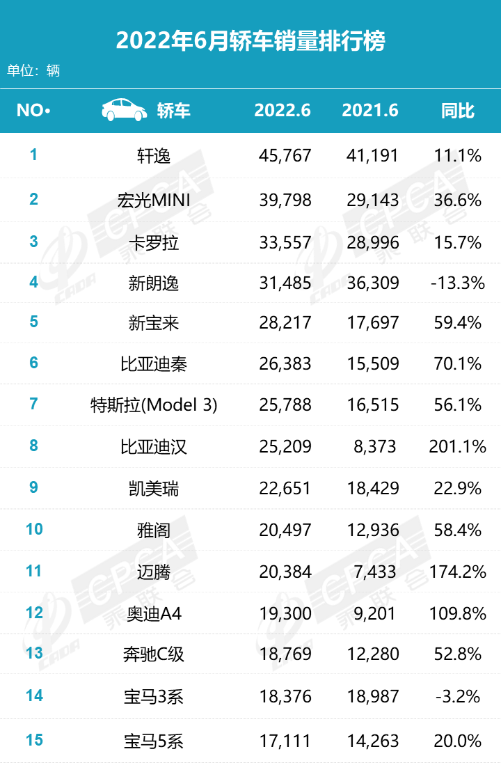 纵观6月的轿车市场,变化比较大,尤其是德系轿车“反攻”的态势更加明显。首先,老大和老二的位置再次调换,这次是轩逸拿到了销冠,宏光MINI屈居第2;卡罗拉由上月第7升至本月第3,凯美瑞、雅阁排名第10、第11;新朗逸、新宝来紧随其后,分列第4、第5,迈腾排名第11;上月进入前5的比亚迪汉、比亚迪秦,即便本月销量再次攀升,但只能排到第8、第6;特斯拉Model 3排名第7。此外,奥迪A4、奔驰C级、宝马3系、宝马5系等4款德系豪华轿车也销量不菲,排名进入前15。但是,长安逸动、吉利帝豪等自主轿车没有出现在榜单中。