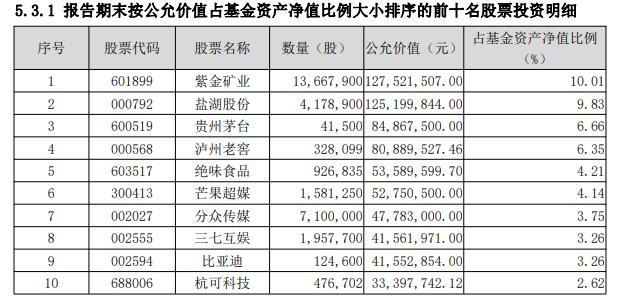 具体看来,该基金二季度十大重仓股分别为紫金矿业、盐湖股份、贵州茅台、泸州老窖、绝味食品、芒果超媒、分众传媒、三七互娱、比亚迪和杭可科技。