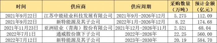 这意味着,新特能源及其子公司自“2022年-2030年”期间累计需要向双良包头公司提供28.41万吨,超过了向通威股份采购的22.25万吨。