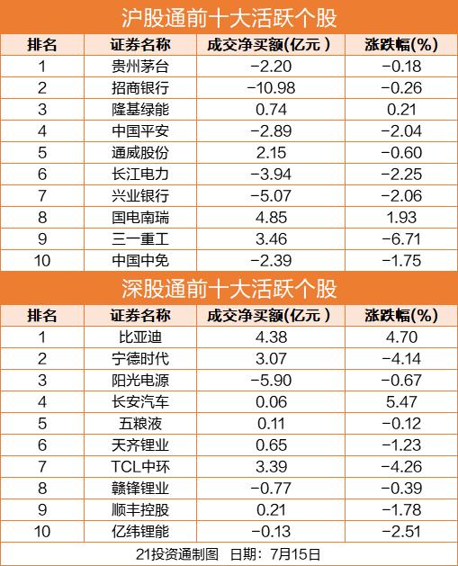 十大活跃个股方面,国电南瑞(600406.SH)、比亚迪(002594.SZ)、三一重工(600031.SH)获净买入居前,金额分别为4.85亿元、4.38亿元、3.46亿元。