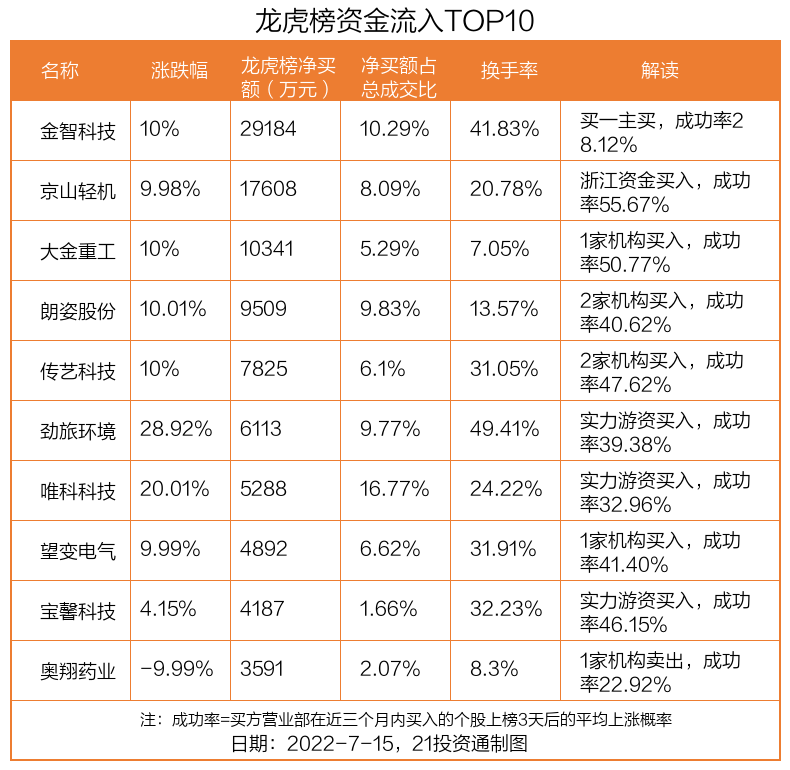 7月15日,上证指数下跌1.64%,深证成指下跌1.52%,创业板指下跌2.08%。盘后龙虎榜数据显示,共有46只个股因当日异动登上龙虎榜,资金净流入最多的是金智科技(002090.SZ),达2.92亿元。