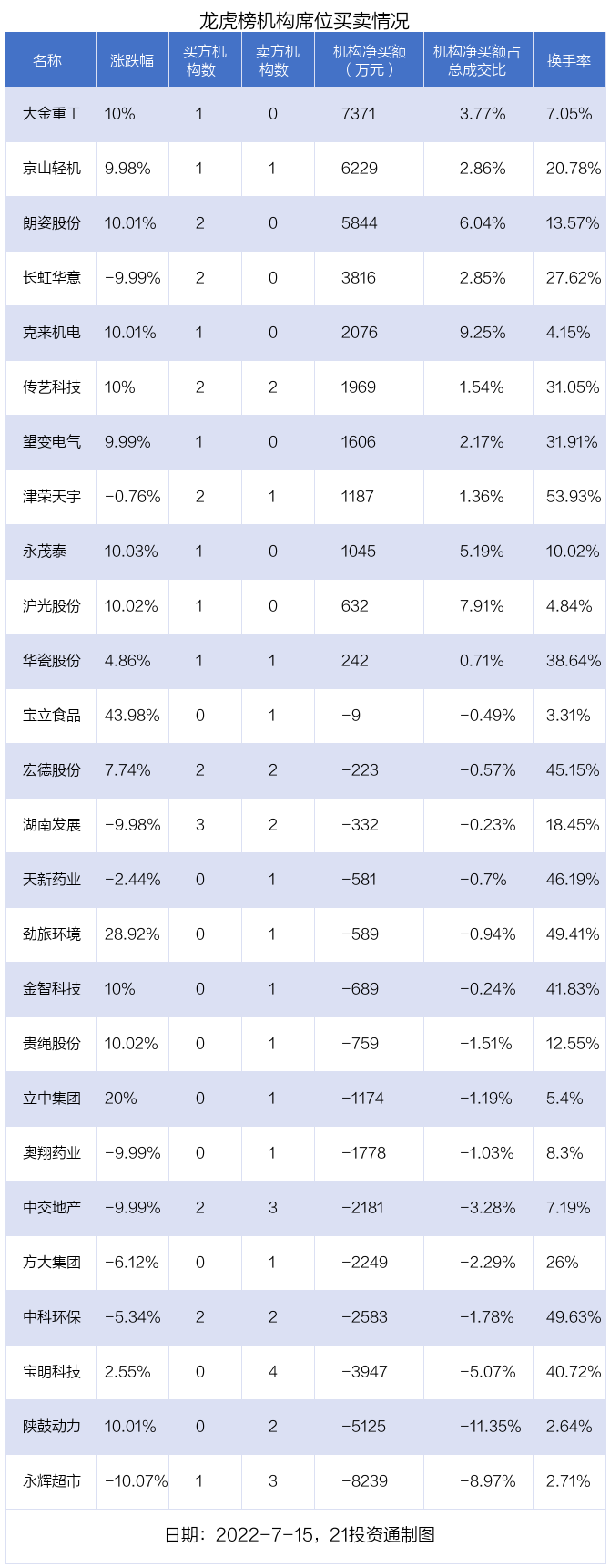 7月15日,26只个股龙虎榜出现了机构的身影,机构合计净买入1558.03万元。具体来看,机构净买入11股,净卖出15股。