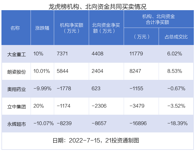 值得注意的是,机构和北向资金共同净买入了大金重工、朗姿股份等2股;共同净卖出了立中集团、永辉超市等2股;在奥翔药业上出现分歧,机构净卖出奥翔药业1778.19万元,北向资金净买入622.8万元。