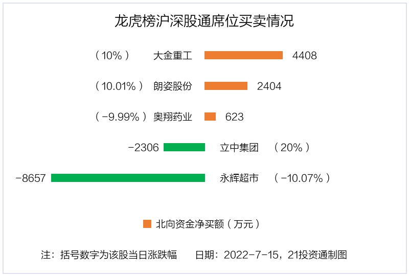 7月15日,北向资金参与龙虎榜中的个股共有5只,合计净卖出3527.43万元。其中沪股通净买入1股,净卖出1股,合计净卖出8033.71万元;深股通净买入2股,净卖出1股,合计净买入4506.28万元。