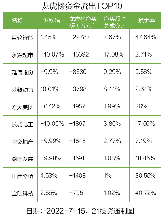 而龙虎榜中资金净流出最多的是巨轮智能(002031.SZ),被净卖出为2.98亿元,占总成交金额的7.67%。巨轮智能收盘上涨1.45%,换手率为47.64%。