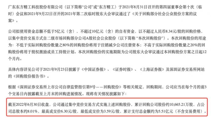 股东减持的同时,东方精工也在大手笔回购公司股份。去年8月31日发布的公告显示,东方精工拟使用不低于5亿元,不超过10亿元的自有资金,以不超过8.34元/股的价格回购公司股份。