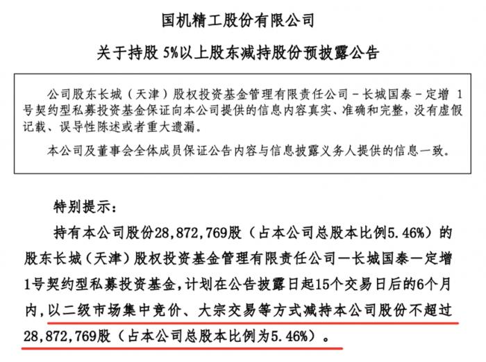 国机精工7月17日公告显示,持有公司2887万股的股东长城(天津)股权投资基金管理有限责任公司-长城国泰-定增1号契约型私募投资基金,计划减持公司股份不超过2887万股(占公司总股本比例为5.46%)。