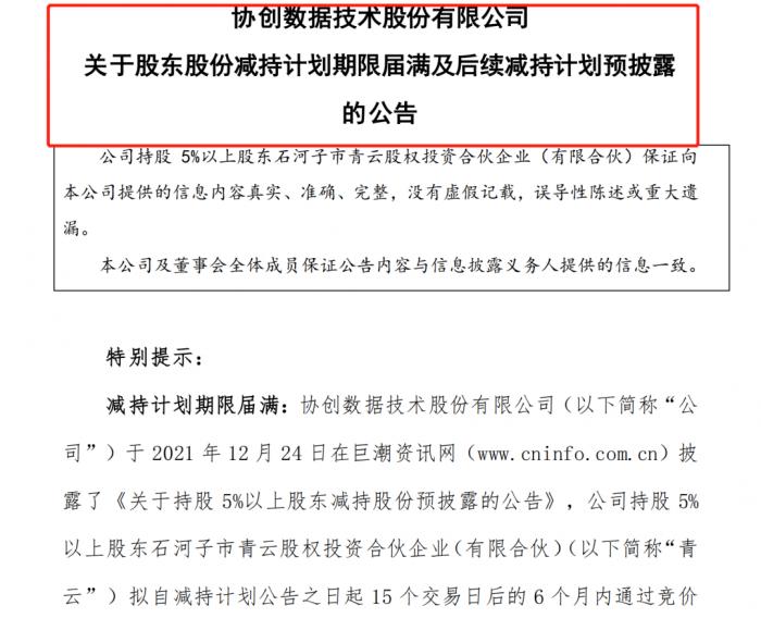 目前,石河子青云持有协创数据6.24%股权。按照最大减持数计算,石河子青云将退出前三大股东序列。