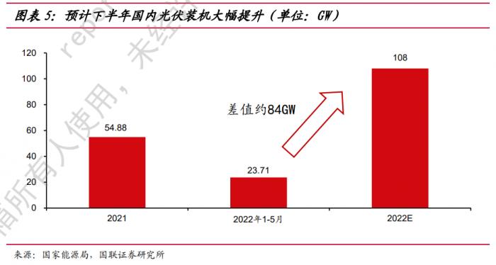国联证券认为,光伏在建项目规模巨大。据国家能源局,2022年1-5月,我国光伏新增装机23.71GW,同比增长139%。而今年5月30日,国家能源局数据显示我国光伏发电在建项目规模为121GW,预计全年光伏发电新增并网108GW,同比去年装机量将提升97%。