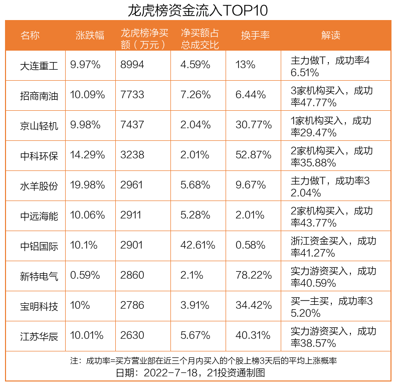 7月18日,上证指数上涨1.55%,深证成指上涨0.98%,创业板指上涨1.44%。盘后龙虎榜数据显示,共有44只个股因当日异动登上龙虎榜,资金净流入最多的是大连重工(002204.SZ),达0.9亿元。