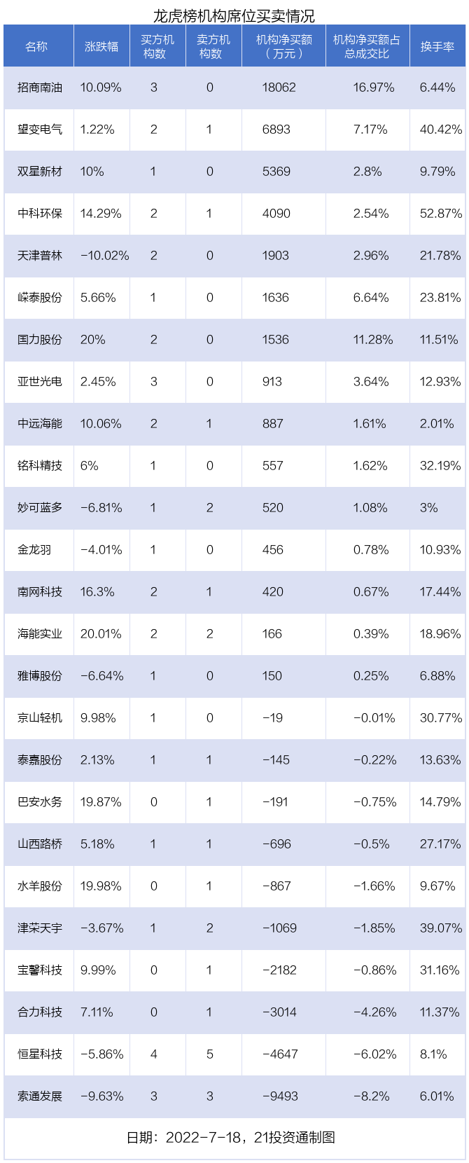 其中,机构净买入金额最多的是招商南油(601975.SH),当日收盘上涨10.09%,换手率为6.44%。