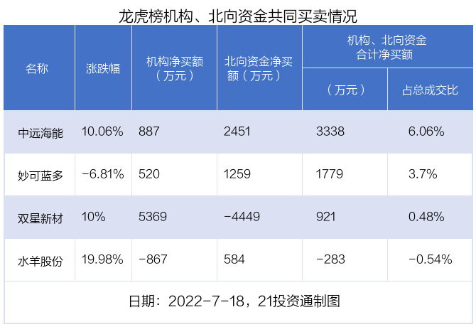 值得注意的是,机构和北向资金共同净买入了中远海能,妙可蓝多;在水羊股份,双星新材上出现分歧,机构净卖出水羊股份866.72万元,北向资金净买入583.86万元;机构净买入双星新材5369.28万元,北向资金净卖出4448.73万元。