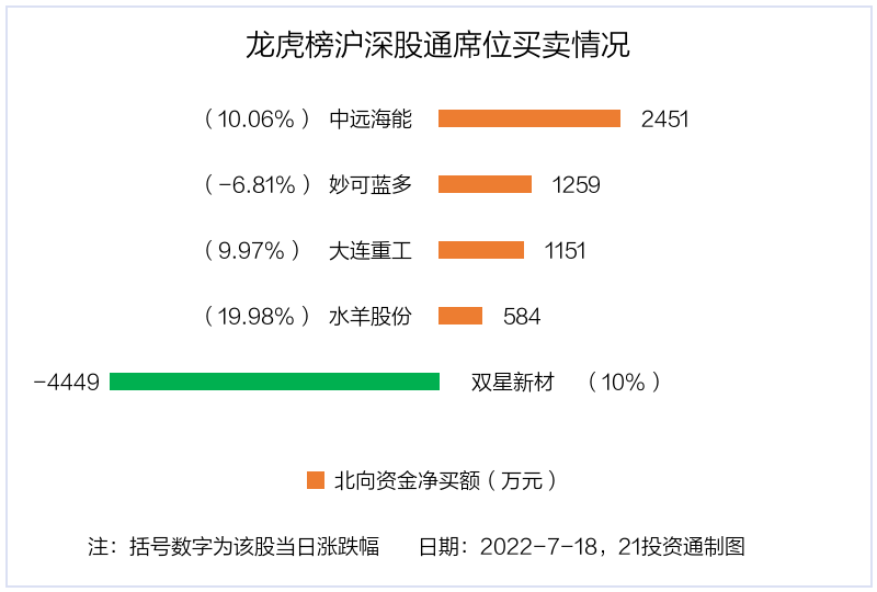 7月18日,北向资金参与龙虎榜中的个股共有5只,合计净买入996.32万元。其中沪股通净买入2 股,合计金额为3710.19万元;深股通净买入2 股,净卖出1 股,合计净卖出2713.87万元。