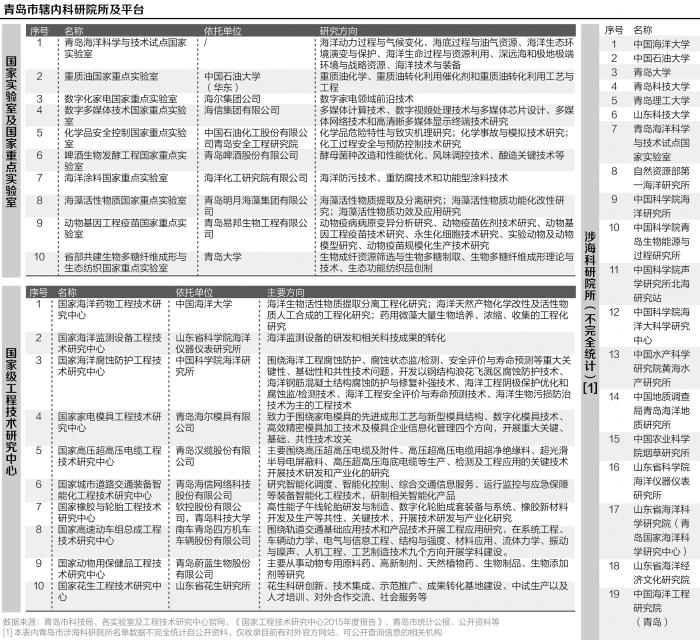 目前青岛共落地1家国家实验室、9家国家重点实验室以及10家国家级工程技术研究中心,研究方向覆盖海洋动力、海洋生物、海洋生态、海洋技术与装备等多个领域。